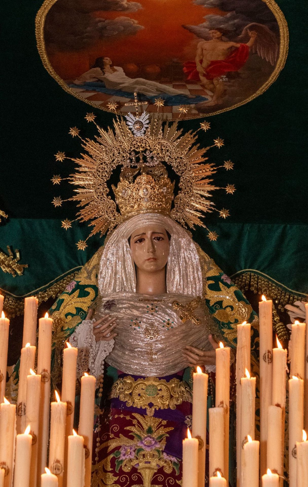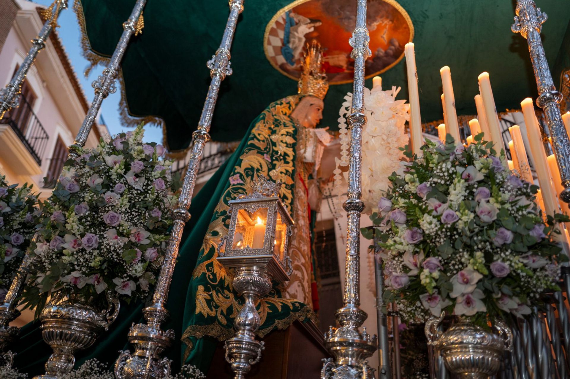Aparece tocada para esta salida con corona de Reina Gloriosa, saya bordada en oro y seda sobre terciopelo de color verde y el espléndido manto del mismo color que le es característico, vestimenta que ha quedado a cargo de su tradicional vestidor, Francisco Garví Fernández.
