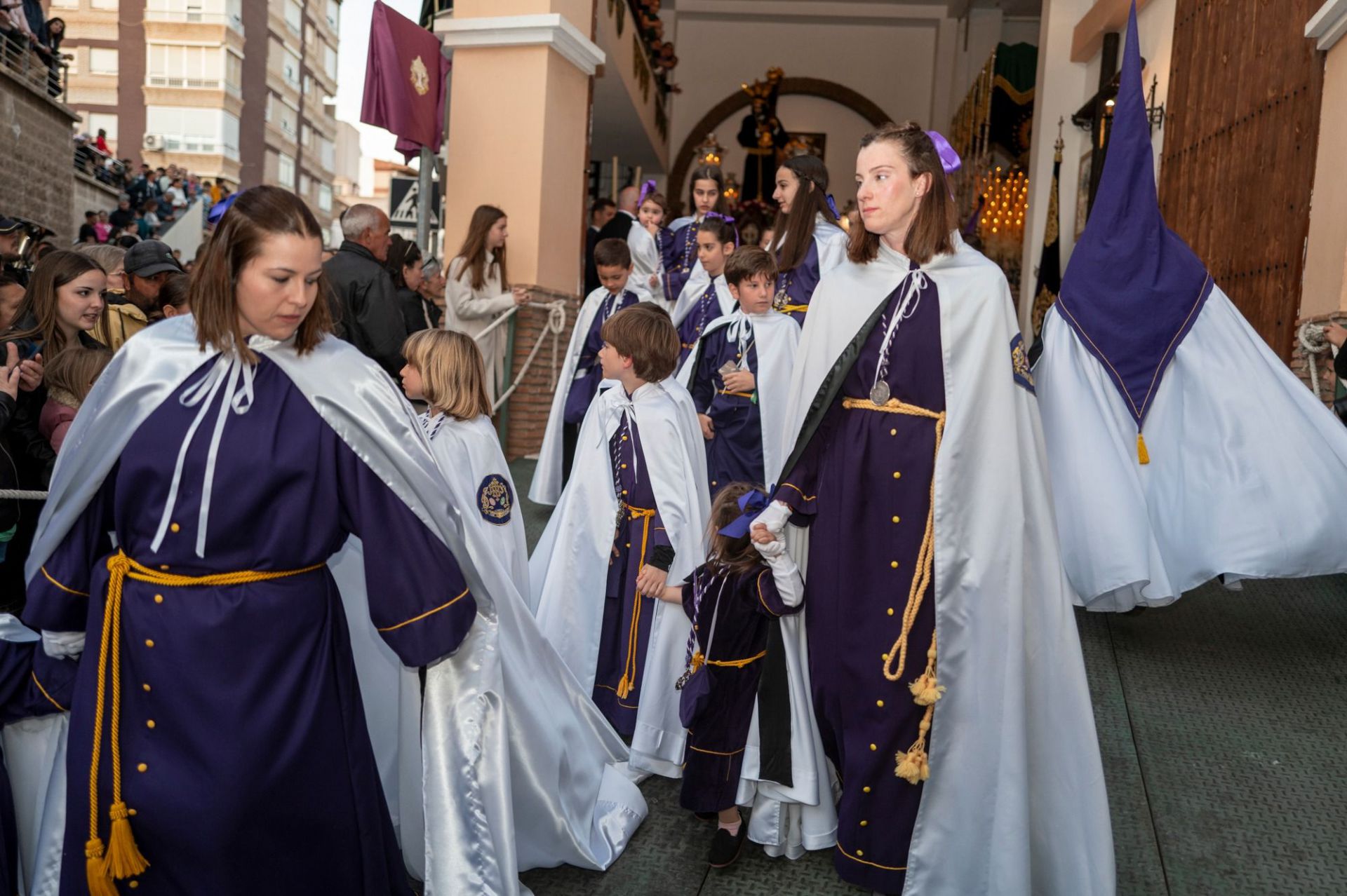 A la hora en que la primera corporación del día ha pasado ya por la tribuna oficial, se dispone a salir la cofradía nazarena desde su casa hermandad. La hora fijada son las 20:30 hrs y, desde hace algo más de una hora, ya se han desplegado en la calle Cañas numerosas personas para ubicarse en un sitio privilegiado en el que poder ver la salida del cortejo nazareno en un especial enclave que, por su trazado, no resulta cómodo para la contemplación de los pasos.