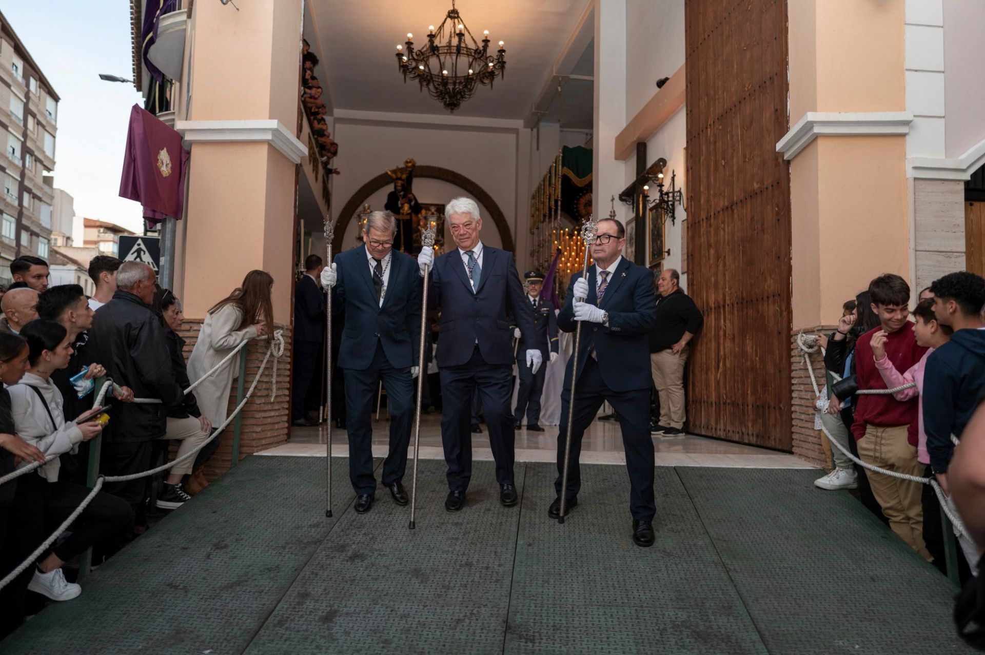 Con la puntualidad que caracteriza a la corporación nazarena, se acercaban a las puertas de la casa hermandad las dos personas que este año ha designado su junta de gobierno para llamar a salir a la calle a la procesión. Se trata de Mari Carmen Olvera García y Concepción Esteban Peña, personas muy vinculadas a la cofradía desde hace muchos años y que por cuestiones de salud no han podido efectuar la estación de penitencia. El abrazo y la emoción embargan a estas dos personas cuyas familias llevan en las venas el sentir nazareno de su Cristo y el de su madre, María Santísima de la Esperanza. Paralelamente, ya se encuentra ubicada calle arriba la Agrupación Musical San Elías y San Juan Evangelista para acompasar con sus sones el paso de misterio. Inmediatamente sale a la calle la antigua cruz de guía escoltada por dos faroles de frente de procesión, a los que siguen las dos filas de hermanos de luz. Preside en su centro la bandera nazarena que deja ver en su centro las iniciales de JHS, “Jesús Hijo Salvador”, bordadas en hilo de oro.