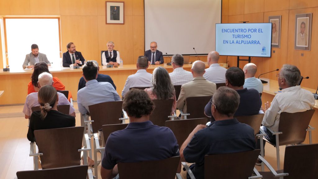 Granados ha presidido la reunión con alcaldes de la Comarca y empresarios turísticos de La Alpujarra en el Ayuntamiento de Órgiva, donde se han abordado las políticas impulsadas por el Gobierno Andaluz dirigidas hacia un turismo más sostenible y desestacionalizado, fruto de una alianza sólida con el sector de la industria turística.