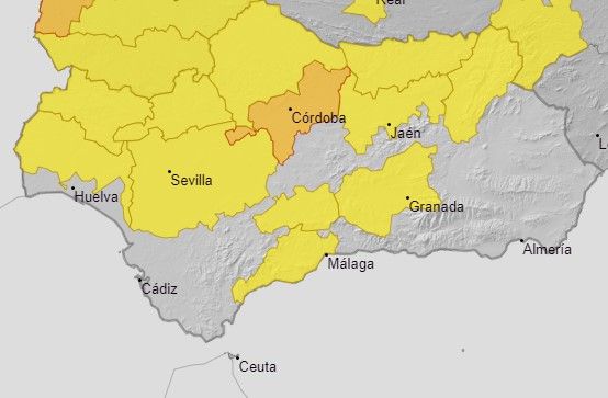 Aviso naranja por temperaturas que llegarán a los 40 grados en la Campiña cordobesa. Amarillo en comarcas de Huelva, Sevilla, Córdoba, Málaga, Jaén y Granada.