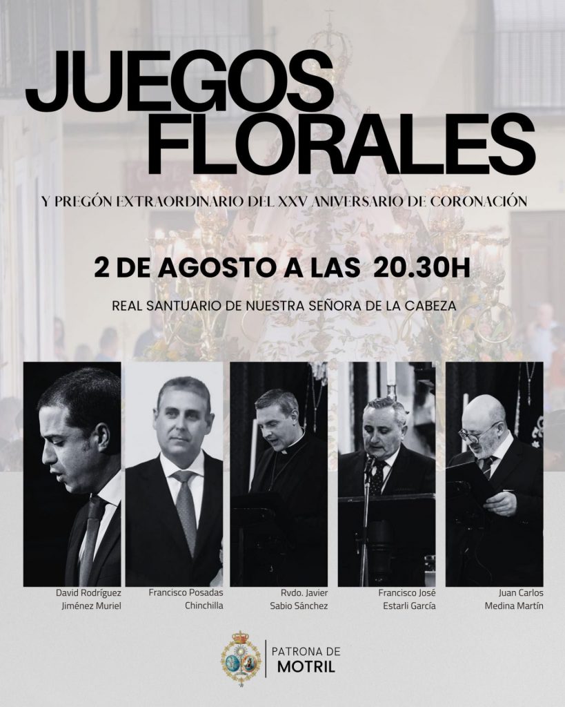 Hoy sábado, 2 de agosto, se vivirá un gran comienzo de los cultos en honor a Ntra. Sra. de la Cabeza Coronada con la celebración de los Juegos Florales Marianos y el Pregón Extraordinario del XXV Aniversario de Coronación, tras la Eucaristía de las 20:00 h en el Real Santuario.