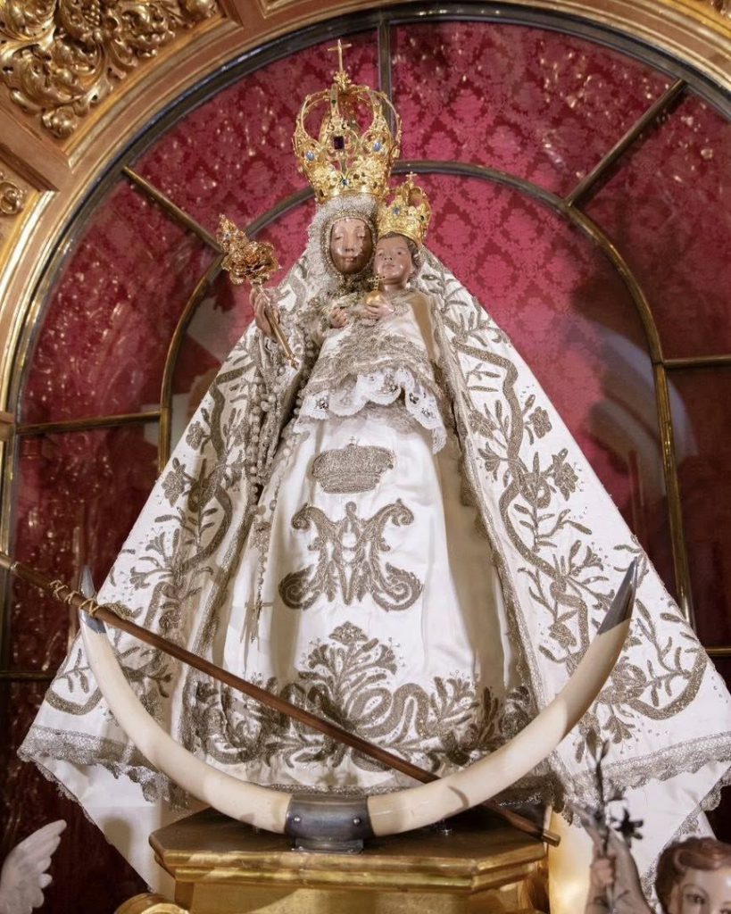 La Santísima Virgen de la Cabeza vuelve a salir de su camarín para la celebración de su fiesta grande, que dará comienzo este sábado. La Priostía ha dispuesto este altar compuesto por más cuarenta luces y una nueva estructura que realza la dignidad del conjunto, aportando además mayor firmeza y seguridad. A los pies de la Sagrada Imagen, en una hornacina, se venera la reliquia del Beato Diego José de Cádiz. En los laterales, los ángeles inferiores del retablo portan un rosario y un incensario que simbolizan, respectivamente, la oración perseverante del pueblo fiel y la alabanza que, como incienso, se eleva hasta el cielo en honor a la Santísima Virgen. El exorno floral será completado el próximo sábado, según se detalla desde la Real Hermandad Sacramental de la Virgen de la Cabeza Coronada, Patrona de Motril.