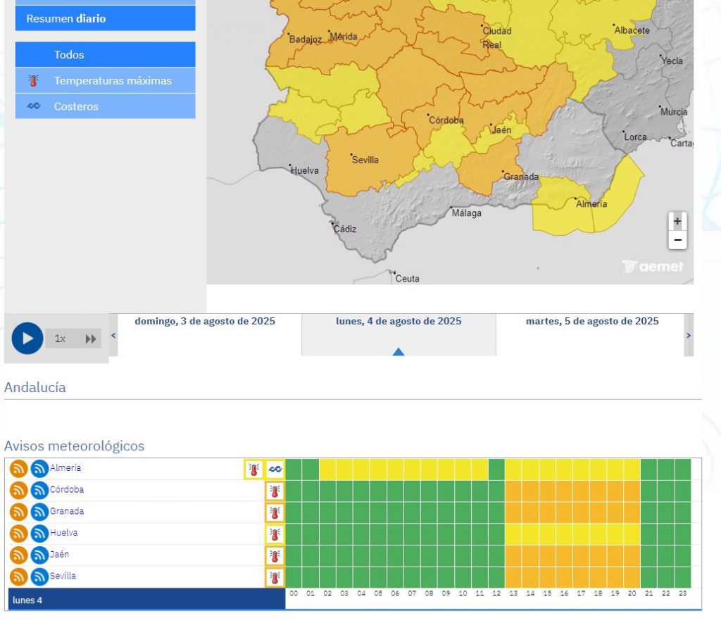 La AEMET anuncia para hoy en Andalucía: cielos poco nubosos o despejados. Nubosidad de evolución diurna en las sierras del interior oriental. Temperaturas con pocos cambios. En Cádiz y el litoral almeriense, vientos moderados a fuertes de levante, con rachas ocasionalmente muy fuertes en el área del Estrecho; en el resto, vientos flojos a moderados, con predominio de la componente sur. Temperaturas significativamente altas en el interior. Rachas muy fuertes en el Estrecho. Ampliado el aviso naranja por altas temperaturas previsto para hoy en Córdoba y Jaén a Granada (Cuenca del Genil) y Campiña de Sevilla.