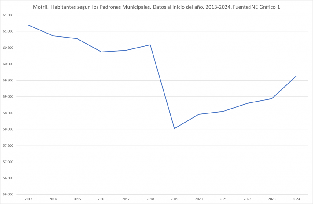 En cuanto a los datos de Motril, empezando por los relativos a la población, el padrón municipal de 2024 reveló la presencia de 59.867 habitantes, población próxima a la existente cuando en 2010 se materializó la segregación del hasta entonces anejo de Torrenueva-Costa (Gráfico 1). La proporción de población extranjera ascendió en ese año al 11,0 % del conjunto de la población, una proporción inferior a la media de España (13,9%). El aumento de la población de Motril en 2024, el 1,18%, fue el más elevado desde 2010. En lo que va de siglo, esto es, entre 2000 y 2024 la población de Motril ha crecido en 9.460 habitantes, casi un 19%.