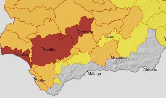 Martes, 12 de agosto, con la ola de calor vigente en la península y buena parte de Andalucía, hoy, de manera especialmente acentuada con aviso rojo por temperaturas máximas de hasta 44 grados en las campiñas de Sevilla y Córdoba y en el litoral de Huelva donde se espera que alcancen los 42. También aviso naranja en Cádiz, Jaén y Granada y aviso amarillo en Málaga, Jaén y Granada por lluvias.