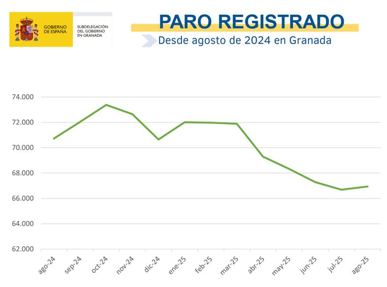 El número de personas desempleadas en la provincia de Granada se situó en agosto en 66.940, lo que supone la cifra más baja registrada para este mes desde 2008. En términos mensuales, el paro ha aumentado en 248 personas (+0,37%) respecto a julio. El incremento es menor en comparación al año anterior, cuando creció respecto al mes anterior en 499 personas (+0,71%). En la comparativa interanual, la reducción alcanza las 3.793 personas, lo que equivale a un -5,36%.