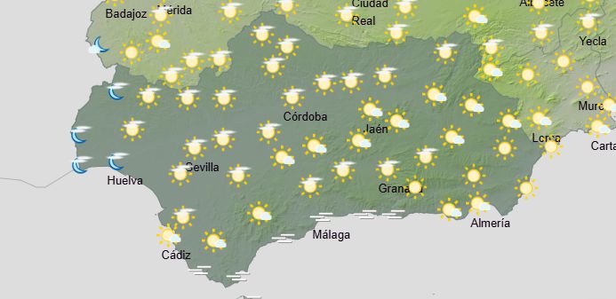 La AEMET prevé para hoy en Andalucía: cielos con intervalos nubosos de nubes altas. Temperaturas mínimas en ligero ascenso; máximas en ascenso en la vertiente mediterránea, en ligero descenso o sin cambios en el resto. Vientos flojos variables, tendiendo a soplar del noroeste por la tarde.