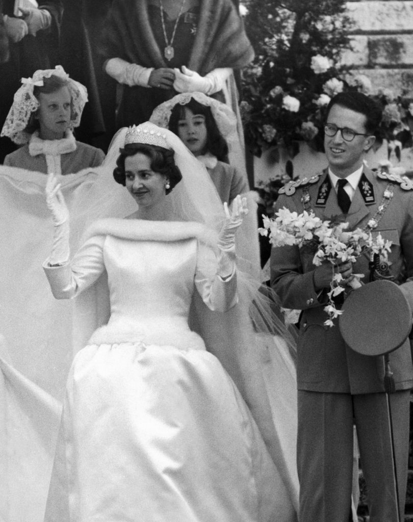 Balduino y Fabiola vuelven a verse en privado en Lourdes a principios de julio de 1960. El rey viaja en un “Dauphine” amarillo alquilado. Pasean, hablan, rezan, y el viernes, 8 de julio, Fabiola dice “Si” a la petición de matrimonio de Balduino. Acuerdan hacer público su compromiso el sábado, 16 de julio, festividad de la Virgen del Carmen, pero la “Crisis del Congo” hace que aplacen el anuncio hasta el viernes, 16 de septiembre, nueva que da el primer ministro belga, Gastón Eyskens (1905 – 1988). Posteriormente, la pareja se reúne con la prensa en el Palacio de Laeken. La boda se va a celebrar el jueves, 15 de diciembre, de ese mismo año. La ceremonia civil tiene lugar en el Salón del Trono del Palacio Real de Bruselas. Inmediatamente después tiene lugar la ceremonia religiosa en la Catedral de San Miguel y Santa Gúdula. Fabiola luce un vestido diseñado por Cristóbal Balenciaga (1895 – 1972): de seda blanca y tul, adornado con armiño; con un escote alto, mangas tres cuartos, cintura caída y una cola de 6 metros de largo. Balduino luce el uniforme de teniente general de las Fuerzas Armadas con la cinta y estrella belga de la Orden de Leopoldo y también lleva, en honor a la novia, la Orden de Isabel la Católica. Radio – Télévision Belge (RTB) y Radio belga en Televisieomroep (BRT) transmiten conjuntamente la señal televisiva en directo de la boda que es retransmitida a las emisoras del continente a través de Eurovisión red. En España, Televisión Española (TVE) lo hace en directo, siendo su primera transmisión en vivo de un evento íntegramente recibido desde el extranjero.