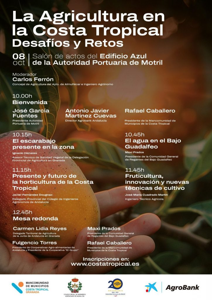 Esta primera jornada está organizada por la Mancomunidad de la Costa Tropical, el Puerto de Motril y AgroBank (CaixaBank), contando como moderador con Carlos Ferrón, ingeniero agrónomo y concejal de Agricultura del Ayuntamiento de Almuñécar.