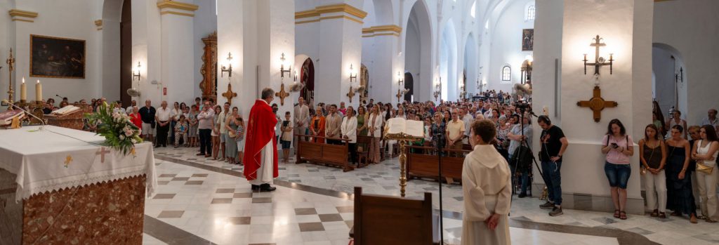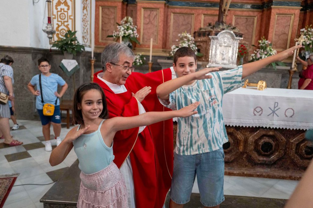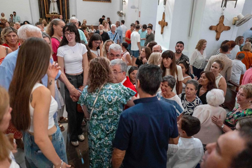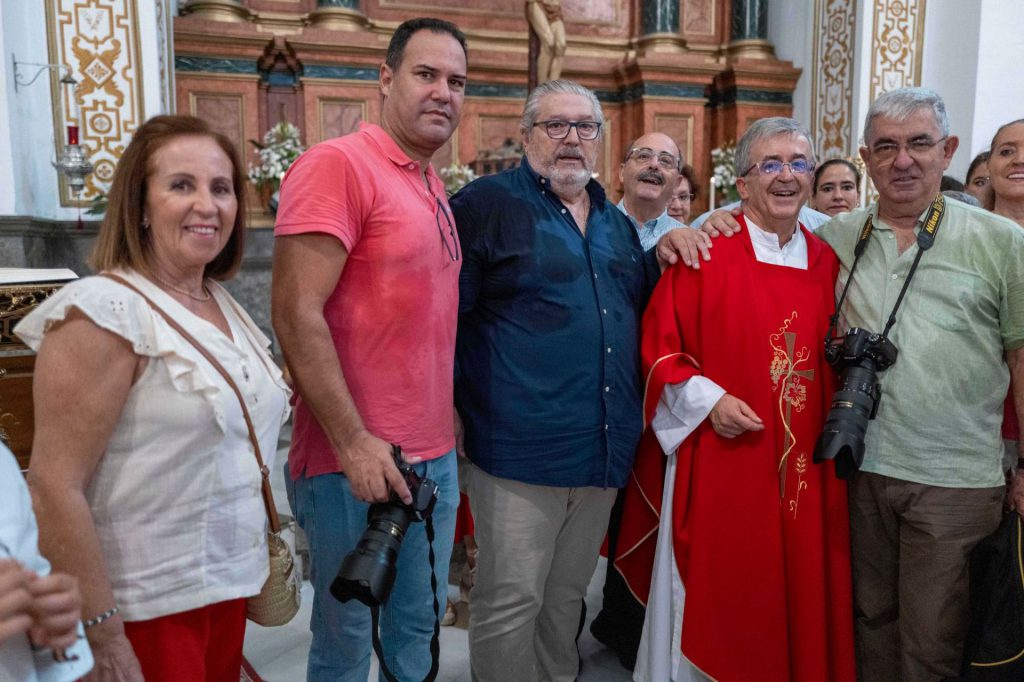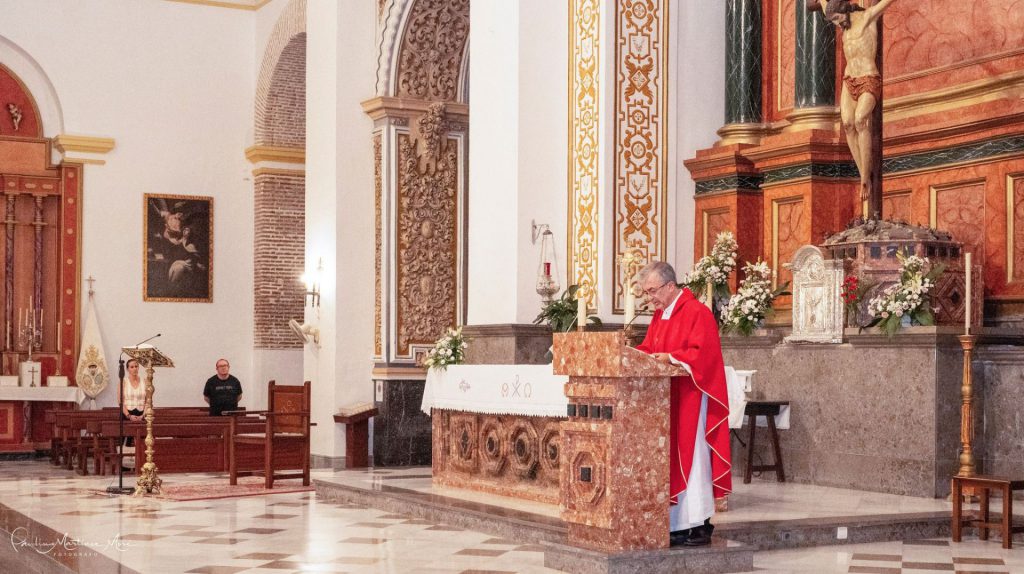 La eucaristía de despedida al párroco tenía lugar a las 12:00 hrs, y ya desde bastante tiempo antes se hacía difícil ocupar un sitio libre en la iglesia. La acogida de los fieles ha sido multitudinaria, y no se recuerda un hecho similar, pues las naves laterales, incluso, han estado abarrotadas de fieles que han tenido que seguir la santa misa de pie. La eucaristía ha sido presidida por el párroco, estando asistido de los PP. Agustinos D. Bonifacio Diez Pérez y D. Antonio Manuel Martín Blanco. Desde un primer momento la emoción ha embargado a D. José Albaladejo, que ha tenido palabras de reconocimiento a todas las personas que han estado a su lado a lo largo de los años. Ha recordado a su familia allí presente, a las catequistas, a las cofradías y hermandades, a la institución municipal, al coro de las Angustias, a Pepe “el cartero”, que ha sido su mano derecha en la iglesia y, en general, a todas las familias, personas e instituciones que le han tenido como “pater”, como guía espiritual y como amigo. En su exposición ha recordado los buenos momentos vividos en la parroquia desde que fue destinado a ella hace trece años. Asimismo, los difíciles de la pandemia, en la que la iglesia tenía que separar a los fieles con pegatinas de colores para evitar los contagios, los días de alegría de matrimonios, bautizos y comuniones y también, como no, los tristes de entierros de personas conocidas y no conocidas que ya no se encuentran con nosotros.