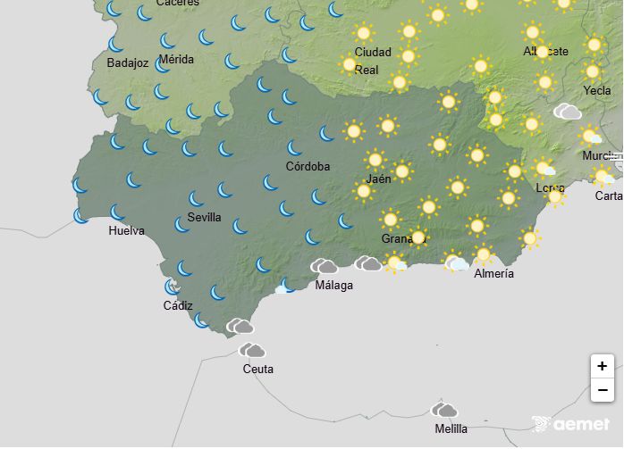 La AEMET anuncia para este miércoles en Andalucía: cielos poco nubosos o despejados. Nubes bajas y brumas en el litoral mediterráneo y el Estrecho, sin descartar bancos de niebla. Nubosidad de evolución diurna en las sierras del interior oriental. Temperaturas con pocos cambios. Vientos flojos variables. Levante moderado en el litoral mediterráneo oriental y en el área del Estrecho, con intervalos fuertes y rachas ocasionalmente muy fuertes. Aviso amarillo por calor ampliado a Granada y Huelva.