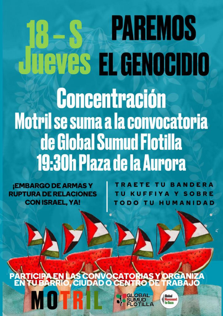 «Convocamos a todas aquellas personas que sientan un compromiso humano con el pueblo palestino a participar en la concentración que tendrá lugar en la plaza de Aurora de Motril, el jueves 18 de septiembre, a las 19:30 horas»
