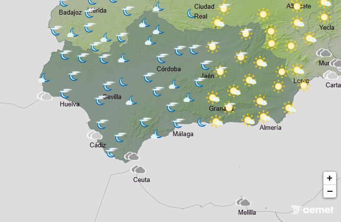 La AEMET anuncia para este viernes en Andalucía: cielos nubosos, predominando las nubes medias y altas, con una pequeña probabilidad de chubascos aislados en las sierras por la tarde. Intervalos de nubes bajas y brumas matinales en el Estrecho. Temperaturas mínimas sin cambios, localmente en ascenso; máximas en descenso, localmente sin cambios. Vientos moderados de levante en el litoral almeriense y la provincia de Cádiz, que en el área del Estrecho soplará fuerte con rachas ocasionalmente muy fuertes; en el resto, vientos flojos variables, con intervalos moderados de componente sur por la tarde. Aviso amarillo este viernes por altas temperaturas en Córdoba, Jaén y Sevilla con máximas de 38ºC.
