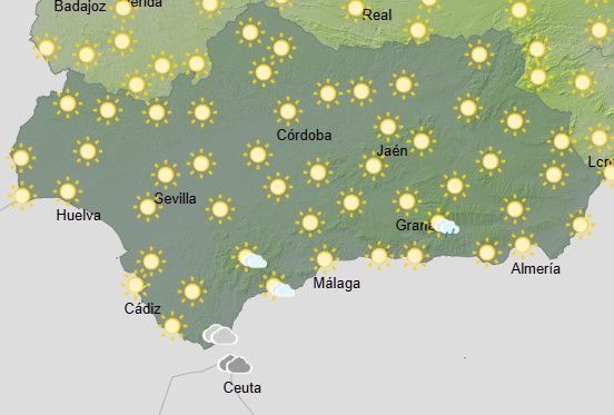 La AEMET prevé para este viernes en Andalucía: cielos con intervalos nubosos en la vertiente mediterránea, sin descartar chubascos ocasionales por la tarde en las sierras; poco nubosos en el resto. Temperaturas sin cambios, localmente en ascenso. Vientos flojos variables. Levante moderado en el Estrecho.