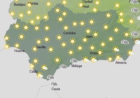 La AEMET prevé para hoy en Andalucía: cielos en general poco nubosos, salvo intervalos de nubes bajas y brumas matinales en la vertiente mediterránea, sin descartar lloviznas en el área del Estrecho. Por la tarde se espera nubosidad de evolución diurna, pudiendo ir acompañada de chubascos ocasionales en las sierras orientales. Temperaturas mínimas con pocos cambios; máximas en ligero ascenso o sin cambios. Vientos flojos variables. Levante fuerte en el Estrecho.