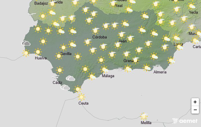 La AEMET anuncia para hoy en Andalucía: cielos poco nubosos o despejados, aumentando durante la tarde a intervalos nubosos en la vertiente mediterránea, donde no se descartan precipitaciones débiles y dispersas a partir de la tarde. Temperaturas en general con pocos cambios, localmente mínimas en descenso. Vientos variables flojos, tendiendo a componente este moderados en el litoral mediterráneo durante la tarde. Poniente moderado en el Estrecho tendiendo al final del día a levante moderado.