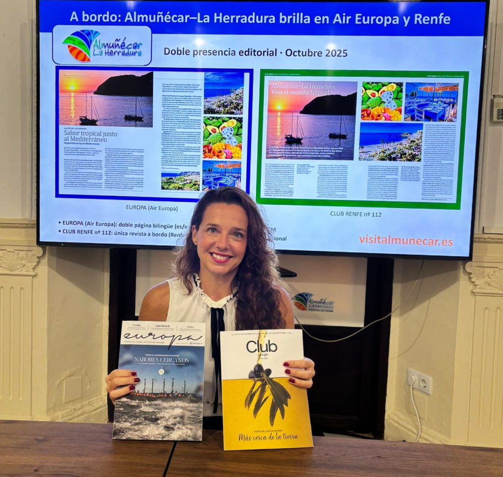 El número de octubre de “Europa” (Air Europa) publica una doble página bilingüe: “Almuñécar – La Herradura: Sabor tropical junto al Mediterráneo”, y el nº 112 de “Club Renfe” incluye: “Almuñécar – La Herradura: Vivir el encanto tropical”. Ambas cabeceras suman una amplia difusión a bordo y canales digitales, reforzando la desestacionalización y el posicionamiento del destino.