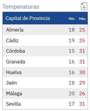 La AEMET anuncia para hoy miércoles en Andalucía: cielos poco nubosos con intervalos de nubes bajas matinales en Cádiz. Nubosidad de evolución diurna en las sierras, sin descartar chubascos aislados en el interior oriental, que pueden ir acompañados de tormentas. Temperaturas mínimas sin cambios; máximas en descenso en la vertiente atlántica, y sin cambios o en ascenso en la mediterránea. Vientos variables flojos, tendiendo a componente oeste por la tarde.