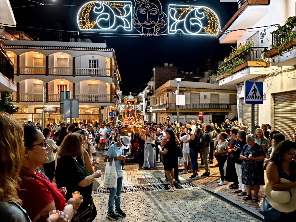 El regreso de la “Romería del Rosario” ha tenido lugar a las 20:30 hrs, tras verificarse el castillo piro-musical que ha sido contemplado de forma multitudinaria desde los aledaños del paseo de la playa. La comitiva ha estado acompañada por numerosos fieles con velas encendidas y el coro “Cantares” de Salobreña, que ha animado todo el recorrido con alegres canciones. Llegada la Virgen hasta la ubicación del “Hostal Mari Tere” se ha encendido un castillo de fuegos artificiales, lugar desde el que el cortejo ha llegado hasta la propia ermita, donde se ha vuelto a repetir una traca de cohetes. Finalmente, con la imagen colocada en su hornacina, el párroco, D. Jorge Nieto, ha entonado una oración y ha dado la bendición a los presentes.