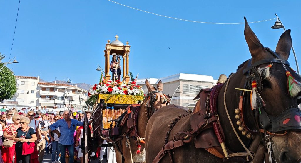 La Romería del Rosario, auténtica fiesta de devoción popular y romera, se verificaba en la mañana del domingo, 5 de octubre, con la recepción oficial de los caballistas junto al apeadero de la villa. Desde allí se han desplazado hasta la plaza del ayuntamiento para dar inicio a la misma a las 11:00 h de la mañana. En ese lugar se ha concentrado una gran multitud de vecinos, miembros de la colonia de extranjeros y visitantes llegados desde distintos puntos de la provincia y alrededores para acompañar a la Virgen en su tradicional recorrido hasta la playa. La imagen mariana que preside el acto romero recibe culto en la hornacina erigida en la calle de su nombre y era acogida por su hermandad en el día anterior a la espera de que en la propia mañana del domingo pudiera ser ubicada en la carreta que ha sido adquirida por dicha corporación en este año. Cuenta ésta, como novedad, que va tirada por dos mulos ante la imposibilidad de encontrar el aparejo de los dos bueyes que le son característicos.