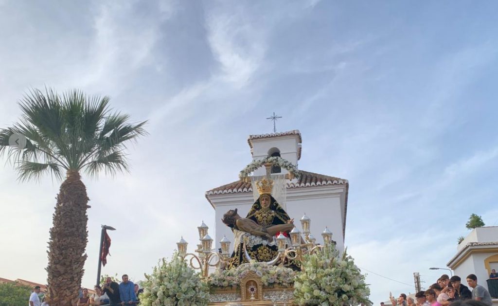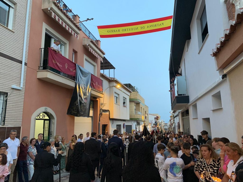 La Señora camina por su barrio como Reina de las Angustias -desde las 18:00 horas-, bajo los sones de la Banda de Música de Rincón de la Victoria.