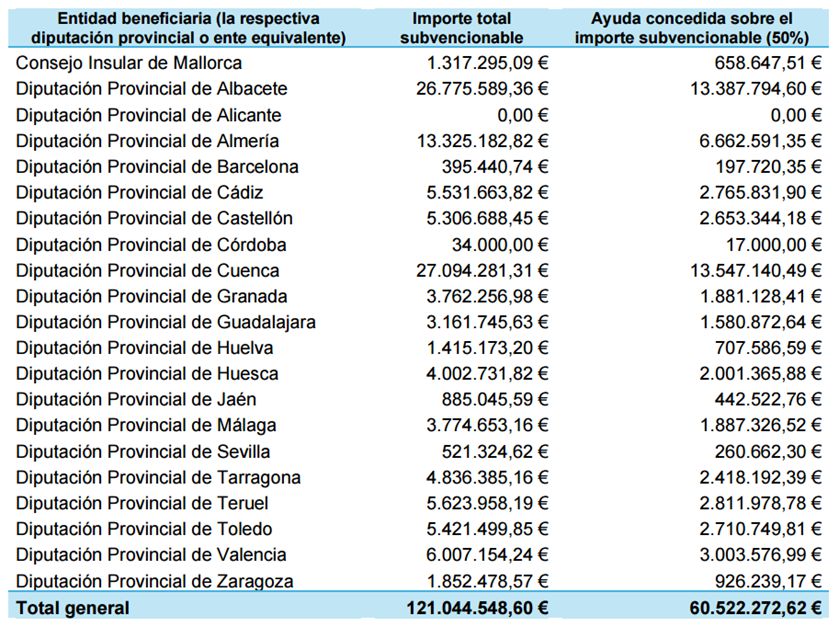 Las subvenciones convocadas tienen por objeto financiar en un 50% los proyectos directamente relacionados con los daños de la DANA que ejecuten los ayuntamientos, los consejos insulares, las diputaciones provinciales, las comarcas y las mancomunidades. Serán obras de restitución de infraestructuras, equipamientos o instalaciones y servicios municipales y de las mancomunidades, además de en Andalucía, en la Comunitat Valenciana, Castilla-La Mancha, Illes Balears, Cataluña y Aragón. En total, se distribuirán a estos territorios afectados 60.522.272,62 euros.