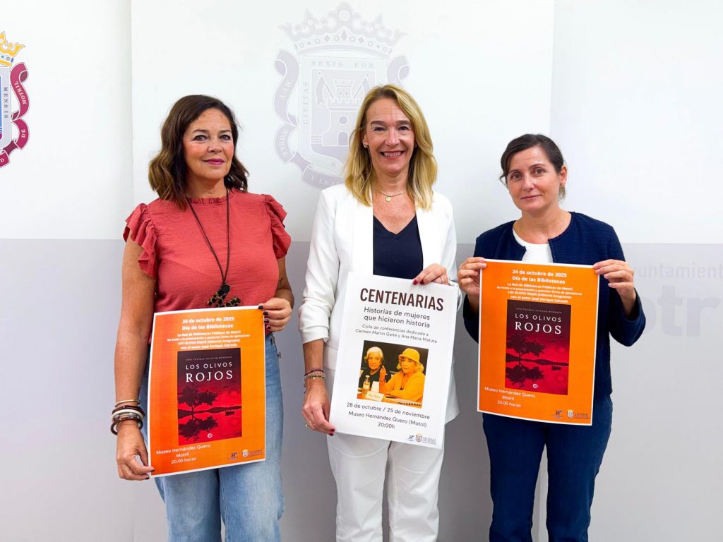 La concejal encargada del área municipal de Educación, Madelin Banqueri, acompañada por la bibliotecaria motrileña, María Jesús Acevedo, han presentado esta mañana dos eventos culturales que se celebrarán en las próximas semanas relacionados con la literatura: por un lado, la celebración del Día de las Bibliotecas, el próximo 24 de octubre, con la presentación del título Los olivos Rojos; y, por otro lado, el ciclo de conferencias Centenarias: Historias de mujeres que hicieron historia, un ciclo de conferencias dedicado a Carmen Martín Gaite y Ana María Matute.