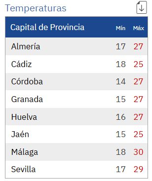 La AEMET anuncia para lunes en Andalucía: cielos nubosos, de nubes altas en la vertiente mediterránea, sin descartar precipitaciones débiles y ocasionales en la vertiente atlántica. Brumas y nieblas matinales. Temperaturas mínimas en ascenso en el tercio oriental y con pocos cambios en el resto; máximas en ascenso en la vertiente mediterránea, y en descenso en las demás zonas. Vientos de componente oeste, moderados con intervalos fuertes en el litoral mediterráneo, y flojos a moderados en el resto.
