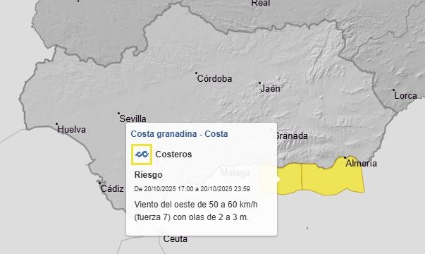 La Agencia Estatal de Meteorología ha activado aviso amarillo en la Costa Tropical por fenómenos costeros, entre las 17:00 y las 23:59 horas, tramo en el que se esperan vientos de hasta 60 km/h (fuerza 7) y olas que pueden alcanzar los 3 metros.