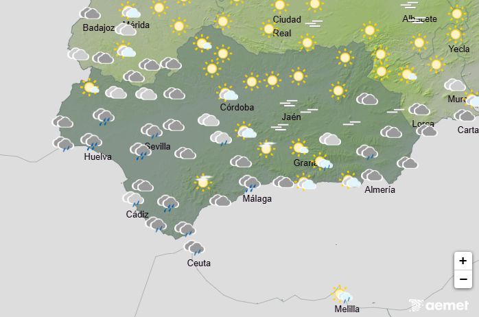 La AEMET prevé para hoy lunes en Andalucía: Cielos con intervalos nubosos o muy nubosos, acompañados de chubascos ocasionales, que podrían ser localmente fuertes primeras horas. Temperaturas en general con pocos cambios, salvo descenso de las máximas en el litoral mediterráneo. Vientos flojos variables.