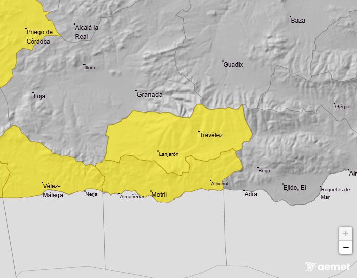 La AEMET también ha establecido aviso amarillo por lluvias en la Alpujarra granadina, desde las 12:00 a las 23:59 horas, anunciando precipitaciones acumuladas de 25 litros/m2 en una hora. El aviso también se extiende a la vecina provincia de Málaga.