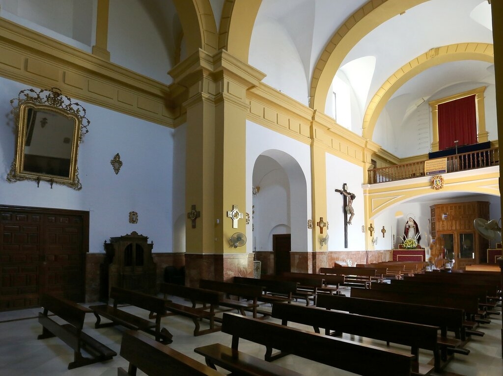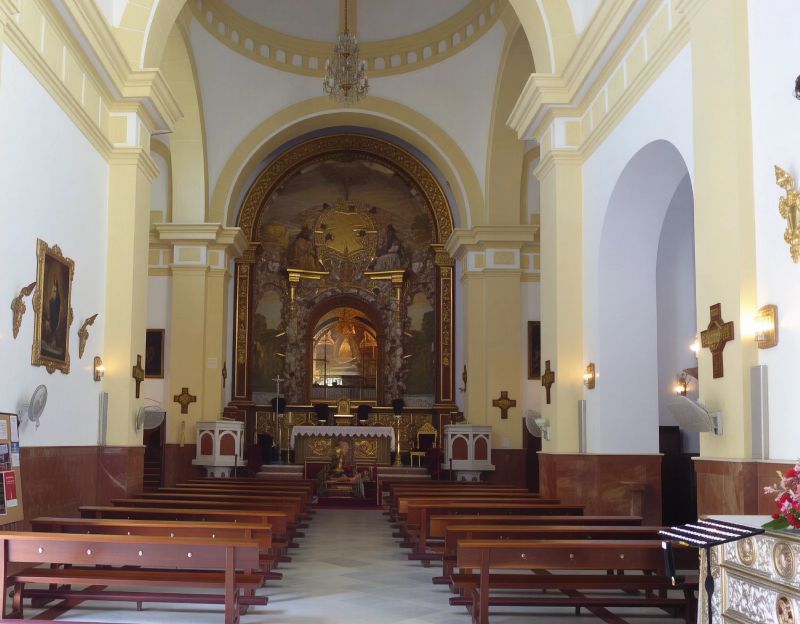 Se levanta sobre planta de cruz latina, tiene una sola nave, cubierta con bóveda de medio cañón con lunetos y dividida en tres tramos por gruesos arcos fajones. Posee una pequeña capilla en el lateral derecho, seguramente dedicada la Virgen en su origen; transepto o nave de crucero amplio y cubierto con cúpula semiesférica rebajada sobre pechinas; capilla mayor rectangular, elevada y profunda cubierta con bóveda de medio cañón; camarín cuadrado en la cabecera cubierto con cúpula semiesférica sobre pechinas, coro en alto sobre arco escarzano a los pies, sacristía a la derecha y torre campanario en la cabecera del templo sobre testero izquierdo.