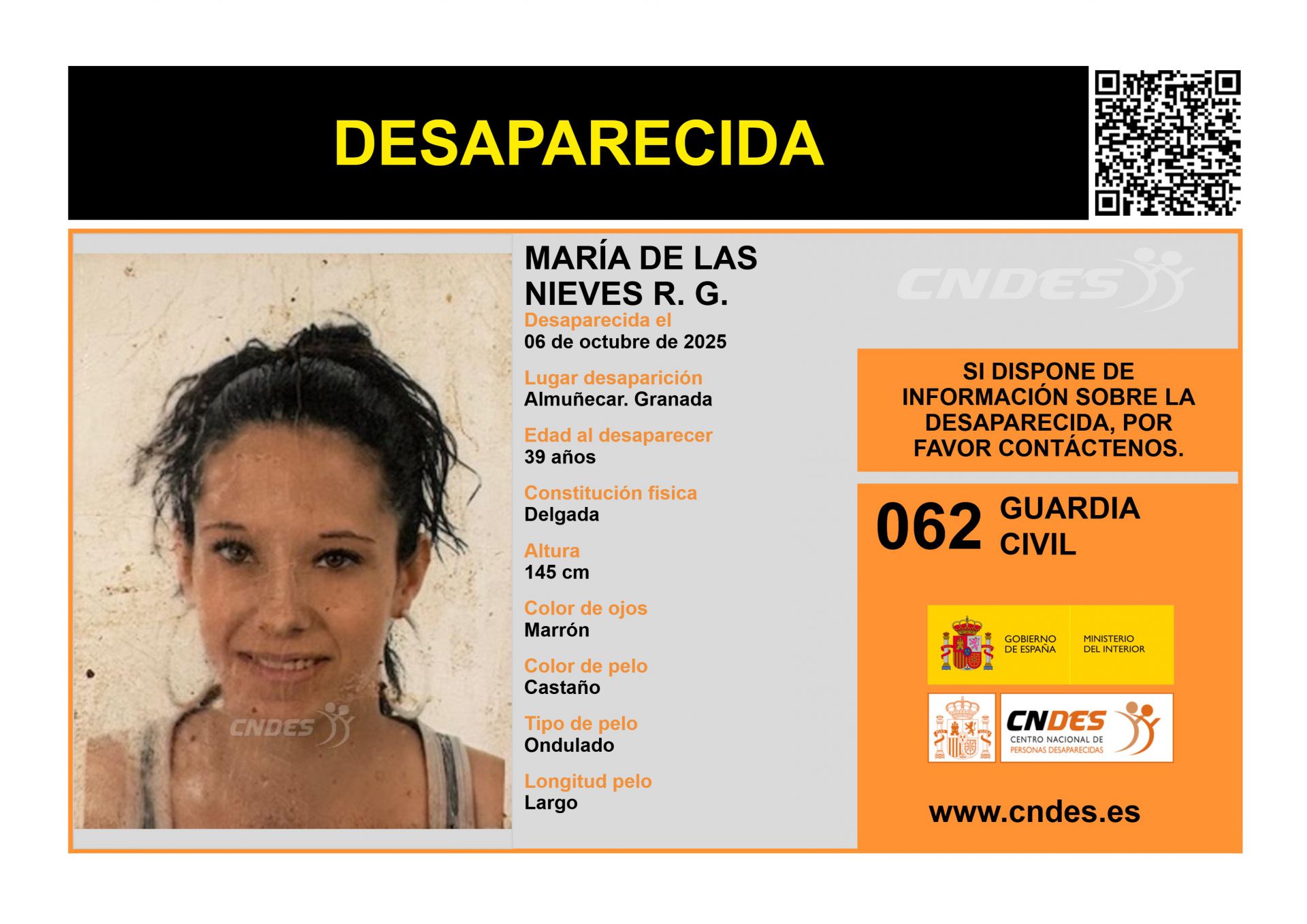 El Centro Nacional de Personas Desparecidas y la Guardia Civil han lanzado una alerta de búsqueda de María de las Nieves R.G., de la que no se sabe nada desde el pasado 6 de octubre de 2025, en la localidad de Almuñécar.