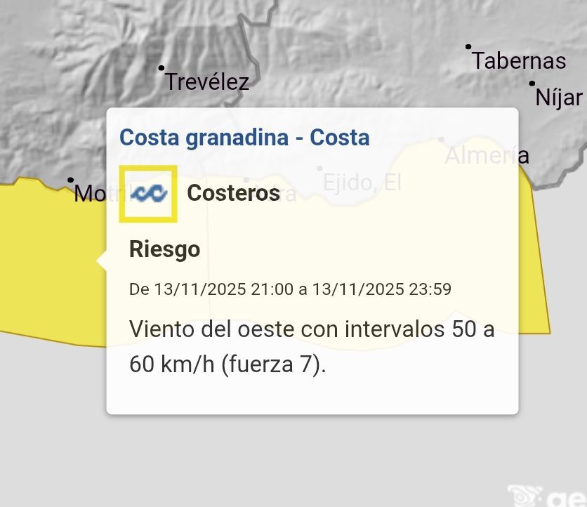 La Agencia Estatal de Meteorología ha activado aviso amarillo por fenómenos costeros en todo el litoral granadino para el jueves y el viernes. Se esperan vientos de componente Oeste con intervalos 50 a 60 km/h (fuerza 7).