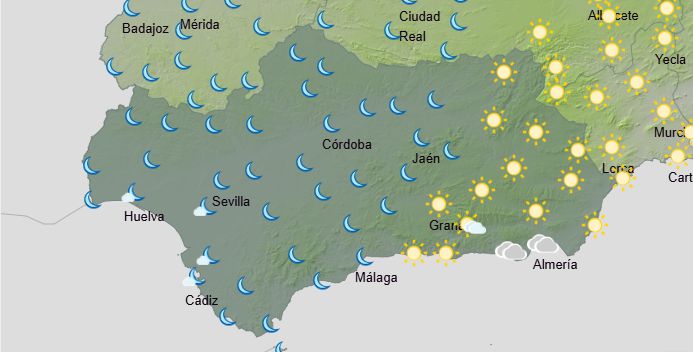 La AEMET prevé para este viernes en Andalucía: cielos poco nubosos o despejados. Intervalos de cielos nubosos en el sureste de la comunidad, donde no se descartan precipitaciones débiles y ocasionales, que serían de nieve por encima de los 1300-1500 metros. Temperaturas en descenso generalizado, produciéndose las mínimas del interior oriental al final del día. Heladas débiles en el interior oriental, localmente moderadas en las sierras. Vientos flojos a moderados de componente norte.
