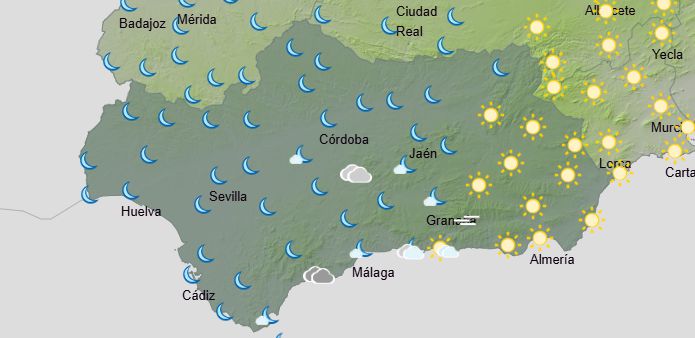 La AEMET anuncia para hoy en Andalucía: cielos poco nubosos, salvo nubes bajas matinales en el litoral mediterráneo, donde no se descartan precipitaciones débiles y dispersas. Temperaturas mínimas sin cambios o en ligero descenso; máximas sin cambios, localmente en descenso en el litoral mediterráneo. Heladas débiles en el interior oriental, localmente moderadas en las sierras. Vientos de flojos a moderados, de levante en el litoral mediterráneo y de componente norte en el resto.