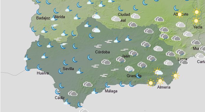 La AEMET prevé para hoy en Andalucía: cielos cubiertos acompañados de precipitaciones débiles a moderadas, más intensas y probables en las sierras Béticas; tendiendo a abrirse claros a partir de mediodía. Temperaturas con ligeros cambios, registrándose las mínimas al final del día. Vientos de componente oeste, flojos a moderados en el interior y moderados con intervalos fuertes en el litoral y las sierras del tercio oriental, con rachas muy fuertes durante la madrugada. Los vientos tenderán a soplar de componente norte durante la segunda mitad del día.