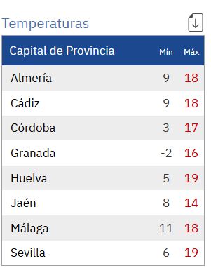 La AEMET anuncia para hoy en Andalucía: cielos poco nubosos o despejados. Temperaturas en ligero ascenso o sin cambios, salvo mínimas localmente en descenso en el litoral atlántico. Heladas débiles en las sierras orientales. Vientos flojos variables, con predominio de la componente norte. Levante moderado en el Estrecho.