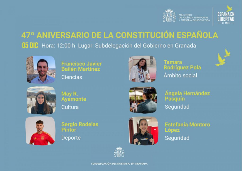 Con motivo de la celebración del 47º Aniversario de la Constitución Española, el próximo 6 de diciembre, la Subdelegación del Gobierno en Granada reconoce la trayectoria de seis jóvenes que con su trabajo, esfuerzo y dedicación en diferentes ámbitos, son referentes en la defensa, promoción y protección de los valores constitucionales.