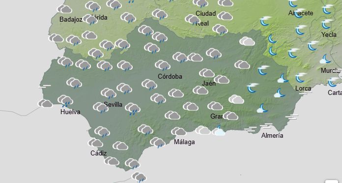 La AEMET prevé para hoy en Andalucía: cielos muy nubosos o cubiertos, con precipitaciones moderadas en la mitad occidental, sin descartar que sean persistentes u ocasionalmente fuertes en el tercio occidental. Brumas matinales. Temperaturas mínimas en ascenso en la vertiente atlántica, con pocos cambios en el resto; máximas en descenso, localmente notable en el interior. Vientos flojos variables.