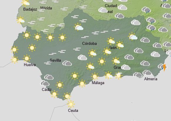 La AEMET anuncia para hoy en Andalucía: predominio de los intervalos nubosos de nubes bajas, tendiendo a poco nubosos con nubes altas por la tarde; salvo en el extremo oriental donde predominarán los cielos nubosos acompañados de chubascos ocasionales. Brumas matinales, más densas y probables en las sierras Béticas. Temperaturas mínimas con pocos cambios; máximas en ascenso. Vientos flojos de componente norte, ocasionalmente moderados.