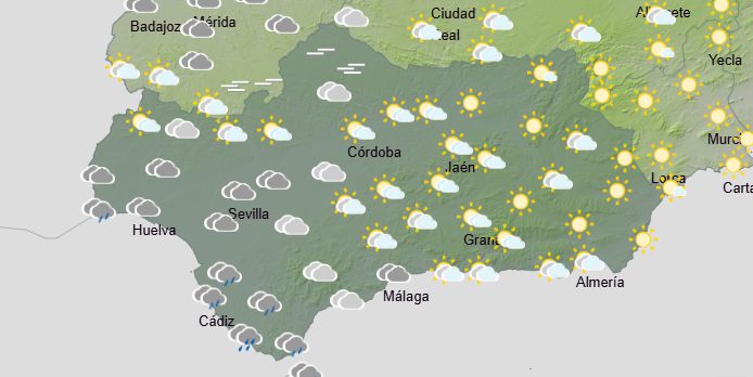 La Aemet prevé para hoy en Andalucía: cielos nubosos en el tercio sur de la comunidad, con precipitaciones débiles o localmente moderadas en el área del Estrecho, sin descartarlas en el resto. Para el resto de la comunidad, cielos poco nubosos en el litoral mediterráneo, e intervalos de nubes bajas y brumas o nieblas matinales en las otras zonas, tendiendo a quedar despejados por la tarde. Temperaturas en ligero descenso o sin cambios, con heladas débiles en las sierras, localmente moderadas en las del tercio oriental. Vientos flojos variables.
