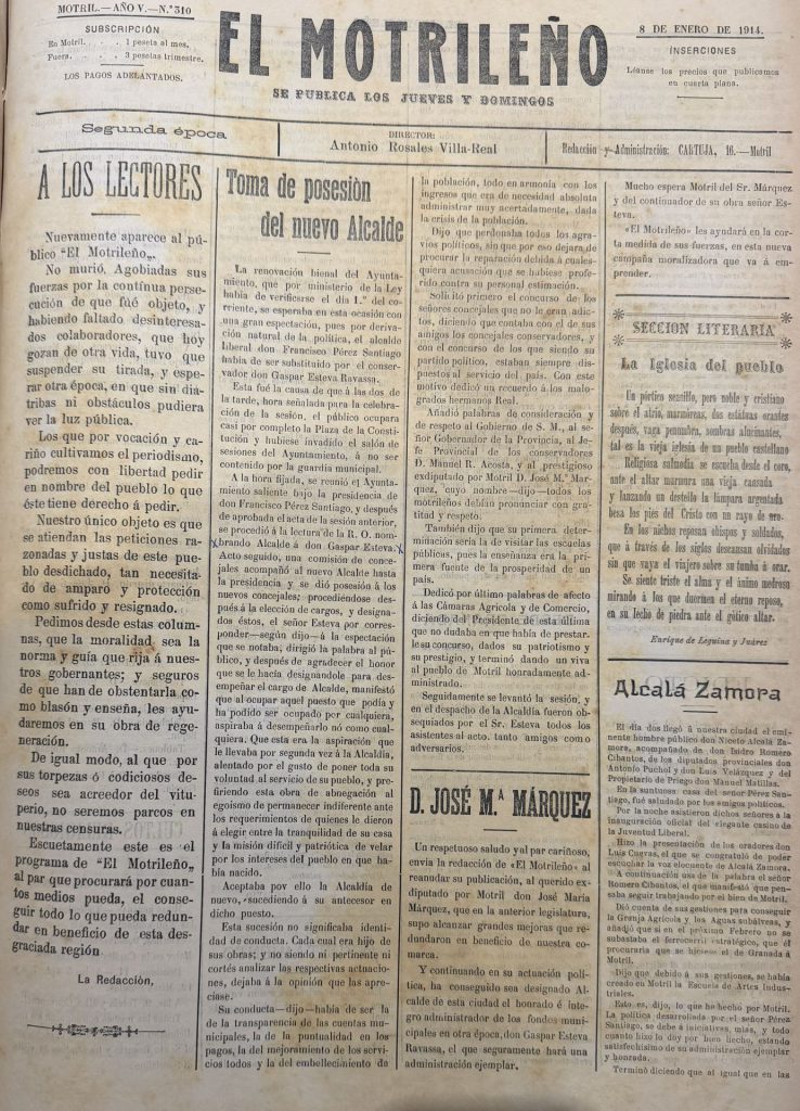 Terminaba el año, por suerte, con tranquilidad y trabajo. Los precios de las subsistencias se habían contenido y por el momento se habían resuelto los problemas de las huelgas obreras. Es verdad que la situación política de los partidos tradiciones seguía complicada, incluso se producían luchas de poder dentro de propio Partido Liberal motrileño donde había varios candidatos para ocupar la Alcaldía y la Diputación: Francisco Pérez Santiago, Juan More de la Torre, Gerardo Murillo Oliveros, Francisco La Chica Mingo y Francisco de Paula Rojas Herrera.