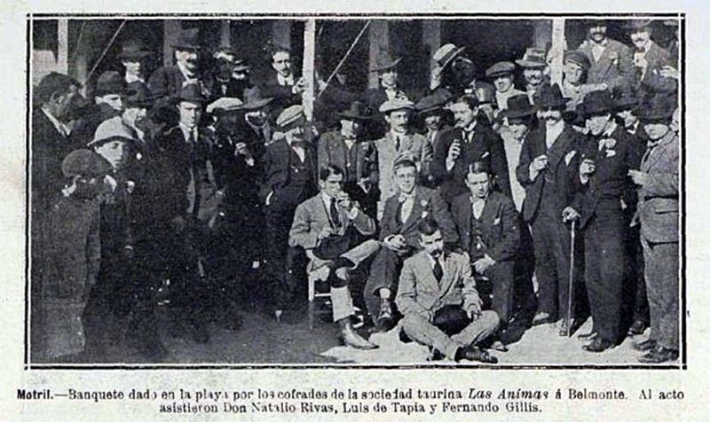 El 1 de marzo llegaba a Motril el diputado a Cortes Natalio Rivas, acompañado de los cultos escritores Luis de Tapia y Fernando Gallí, José de Góngora, Juan y Francisco Moré y los populares toreros José Moreno “Lagartijillo Chico” y Juan Belmonte. Fueron obsequiados en la playa por la sociedad taurina motrileña “Las Ánimas”, con un espléndido banquete en el acreditado restaurante de Ignacio Guerrero. Asistieron, además, José María Banqueri, Francisco Monferrel, Eduardo Sevilla, Fráncico Ruiz, Francisco Jiménez Cuevas, Gerardo Esteva Sánchez, Francisco Herrador, Ricardo Ortega Herrera, Emilio Moré y Antonio Rosales. Se hicieron fotografías.