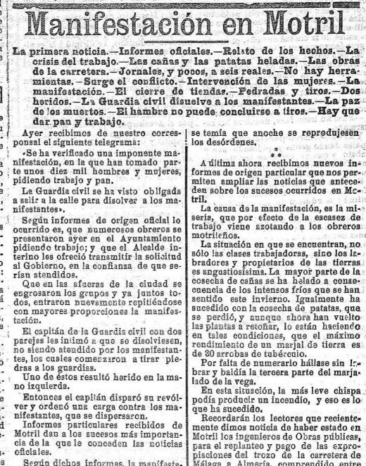 La prensa granadina se hacía eco de la insostenible situación de Motril a fines de enero: “Reina un temporal crudísimo en la bella ciudad costeña, que, unido a la crisis que en todos los trabajos se viene notando, así como en las labores del campo, ha determinado una forzada huelga entre los obreros motrileños, que ya no saben de qué medios valerse para que ellos y sus familiares puedan mal comer. Hemos oído detalles horribles acerca de la miseria que se ceba en infinidad de honrados hogares, antes felices, y hoy entristecidos por la desnudez, el frio y el hambre; existen familias que ya no tienen objetos que empeñar, ni que vender y muchas para las que comer a diario es un lujo. Motril presencia un espectáculo jamás conocido, por las calles se venden, por mujeres famélicas, sillas, enseres de cocina, prendas de vestir, etc”.