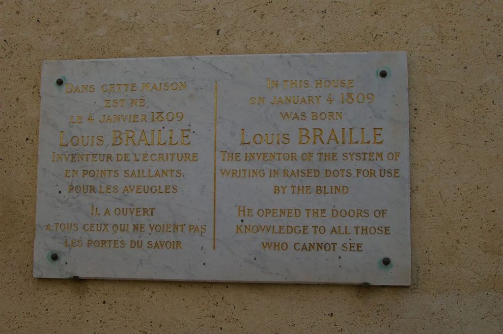 La villa de Coupvray, situada a 35 km al este de París, se extiende sobre una pequeña colina. En lo alto se encuentra la iglesia de Saint-Pierre. En esta iglesia, diminuta y modesta, el domingo, 8 de enero de 1809, es bautizado el pequeño Louis. El hecho es recordado por una placa. A los 3 años (1812), tiene un accidente que le hace perder la vista: toma un tranchete, herramienta puntiaguda que se usa para cortar cuero y, queriendo imitar a su padre, de oficio talabartero, gremio de artesanos que fabrica objetos de cuero para caballerías, se provoca una herida en el ojo izquierdo. La inflamación daña también al globo ocular derecho, y a los 5 años (1814), ya ha quedado totalmente ciego. La ceguera, a tan temprana edad, también tiene consecuencias sobre su movilidad facial, ya que la expresividad ocurre como efecto natural de la imitación de otras personas. Según refería Louis, dirigiéndose a su madre “oigo los pájaros, pero no los veo. ¿Por qué me dejas en la oscuridad? No he hecho nada malo”. A la madre de Louis le desesperan los lamentos de su hijo y tarda largo tiempo en hacerle comprender que no padece un trastorno pasajero, sino que ha de aplicarse para superar su irremediable desgracia.