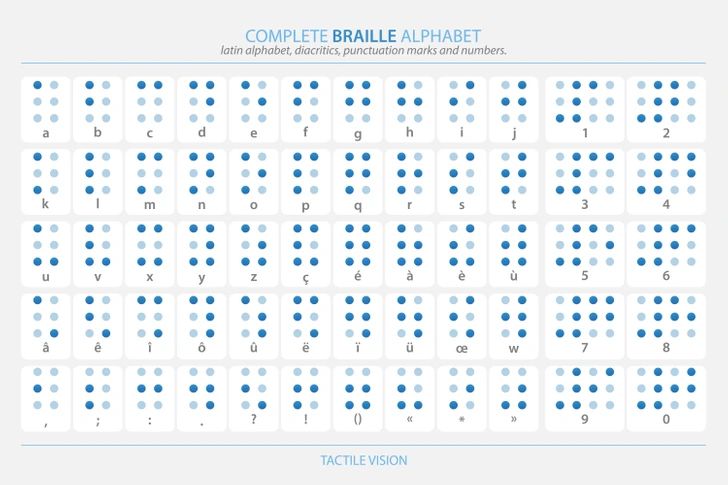 El braille es el sistema de lectoescritura más popular del mundo para las personas ciegas. No es un idioma ni un lenguaje, pues cada idioma adapta sus palabras y tipografías a los puntos. El braille está basado en seis puntos que se ordenan en dos hileras paralelas de tres cada uno. En total, son 64 combinaciones diferentes que representan distintas letras, números, signos de puntuación y musicales, y símbolos matemáticos de acuerdo a qué puntos están en relieve y cuáles no. Además, existen símbolos braille para grafías particulares, signos de puntuación y matemáticas, partituras musicales, etc. Esto lo hace universal, polivalente y capaz de trasladar cualquier letra y carácter. Se lee de izquierda a derecha como otras escrituras europeas, y no es un lenguaje: es un sistema de escritura, lo que significa que puede ser adaptado a diferentes lenguas. Además, se han desarrollado códigos braille para matemáticas y fórmulas científicas. El sistema Braille es de reconocer que tiene la ventaja de ser un alfabeto universal donde las combinaciones de puntos cambian de significado de acuerdo al idioma. Por ejemplo, el braille español está basado en el francés, por lo que se representa la letra Ñ (inexistente en esa lengua) con la vocal Ï (inexistente en español). También se adapta a idiomas que no usan el alfabeto latino como el griego, chino, hebreo, árabe y ruso.