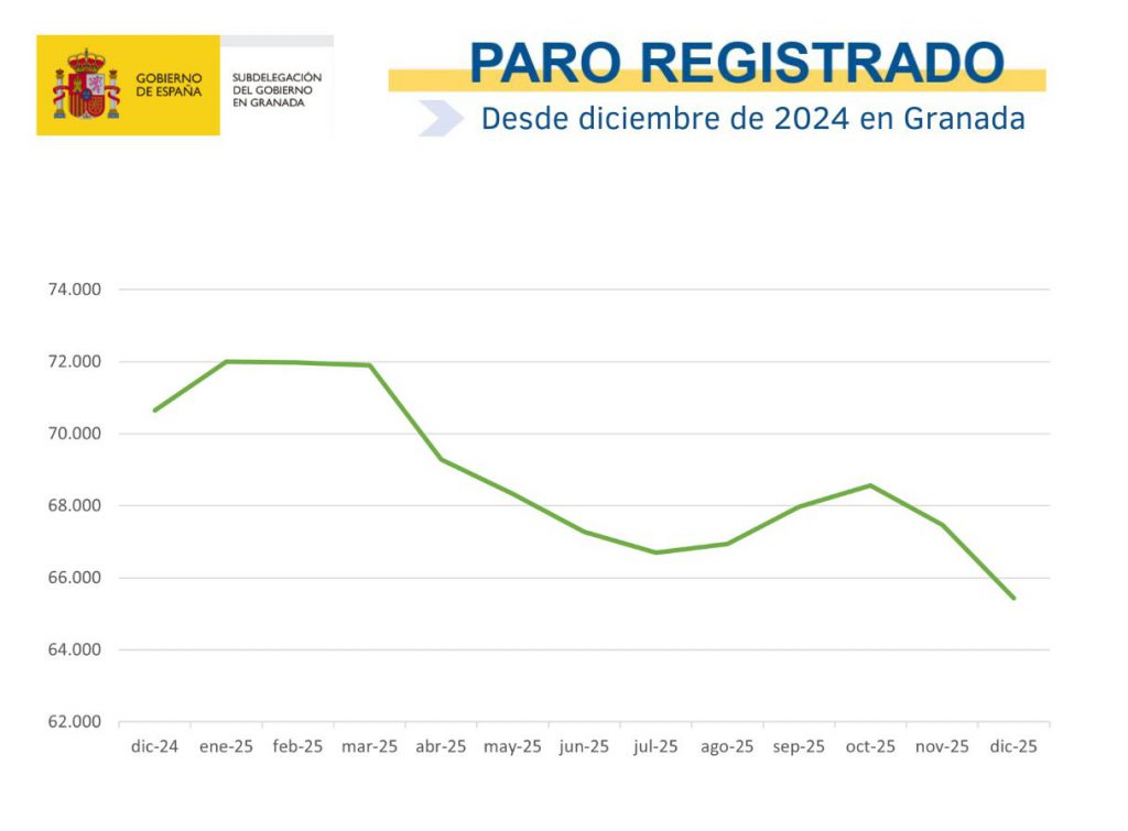 La provincia de Granada ha cerrado el mes de diciembre con un descenso del paro del 3,02%. En total, 2.035 personas han logrado salir de las listas del desempleo, según los datos que ha dado a conocer el Ministerio de Trabajo y Economía Social. Granada reduce así el paro por encima de la media andaluza (2,06%) y de la nacional (0,67%), consolidándose como una de las provincias con mejor comportamiento del mercado laboral en el último mes.
