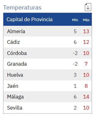 Aemet anuncia para hoy en Andalucía: cielos con intervalos nubosos en la vertiente atlántica, acompañados de precipitaciones débiles dispersas y ocasionales; aumentando a nubosos con nubes bajas por la tarde. Cielos poco nubosos en el resto de la comunidad, con intervalos de nubes bajas en el interior de la vertiente mediterránea por la tarde. Temperaturas mínimas en ligero descenso o sin cambios; máximas en descenso en el valle del Guadalquivir y en el extremo occidental, en ascenso en el resto. Heladas débiles generalizadas en el interior, moderadas en el tercio oriental y en las sierras. Vientos entre flojos y moderados de componente oeste, más intensos en la vertiente mediterránea, donde pueden ser ocasionalmente fuertes en el litoral y en cotas altas.